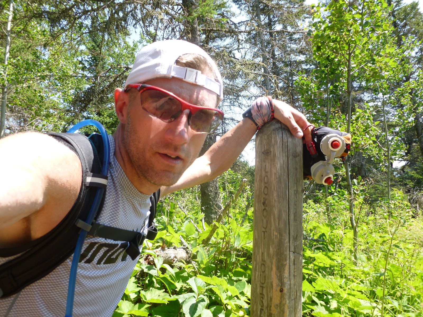 I arrived at the second to last trail post marking the direction to Lookout Louise in 7:36:01 for 35.6 miles. The final push to the end was a mere 4.8 miles and if I could hold pace, I would be well under 9 hours and make my goal, and also beat the time on record. As I took this picture, though not smiling, I really felt like I had the goal in the bag, but then...
